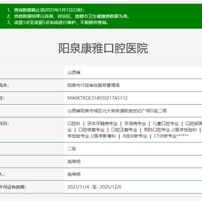 陽(yáng)泉康雅口腔醫(yī)院是一家資質(zhì)正規(guī)的私立牙科機(jī)構(gòu)哦,是由陽(yáng)泉市行政審批服務(wù)管理局審批成立的二級(jí)口腔醫(yī)院,登記號(hào)為MA0KTXQE314030217A5112??笛趴?..