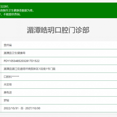 貴州遵義湄潭皓玥口腔門診部是一家正規(guī)的口腔門診部,位于貴州省遵義市湄潭縣湄江街道,跟著美佳網(wǎng)小編一起往下看吧!236z.com一、貴州遵義湄潭皓玥口腔門診部資質(zhì)...